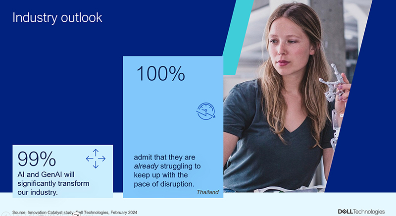 ผลการวิจัย Dell Technologies Innovation Catalyst Research 99% สำหรับองค์กรไทย (เอเชียแปซิฟิกและญี่ปุ่น 85% ทั่วโลก 81%) โดยองค์กรที่รายงานการเติบโตของรายได้เพิ่มขึ้นในปี 2023 มีสูงถึง 91% (เพิ่มขึ้น 25%) และลดลงเหลือ 75% สำหรับองค์กรที่รายงานการเติบโตรายได้ลดลง (1-5%) และมีรายได้คงที่หรือถดถอย