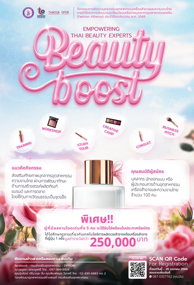ดีพร้อมคอมมูนิตี้… ที่นี่มีแต่ให้ ขอเชิญผู้ประกอบการ บุคลากร นักออกแบบ หรือผู้ประกอบการด้านอุตสาหกรรมเครื่องลำอางและความงามไทย สมัครเข้าร่วม กิจกรรมการพัฒนาบุคลากรในอุตสาหกรรมเครื่องสำอางและความงามไทยภายใต้โครงการพัฒนาและเชื่อมโยงเครือข่ายบุคลากรอุตสาหกรรมแฟชั่น (Fashion Alliance) ประจำปีงบประมาณ พ.ศ. ๒๕๖๘ พร้อมรับสิทธิประโยชน์มากมาย