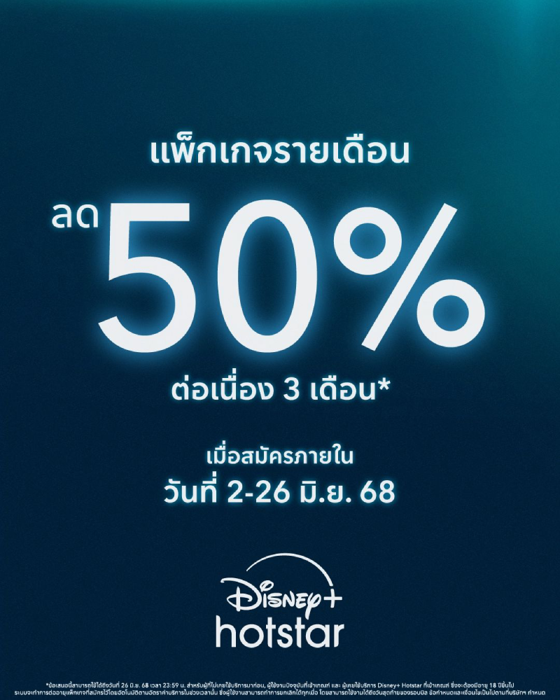 ครั้งแรกในไทย! Disney+ Hotstar จัดโปรแรงฝ่าฝน ลด 50% ให้ฟินฉ่ำ ๆ เสิร์ฟความคุ้มและความบันเทิงจัดเต็มทั้งหนังและซีรีส์คุณภาพระดับโลกแบบจุใจที่นี่ที่เดียว ลดทันที 50% สำหรับแพ็กเกจรายเดือน ต่อเนื่อง 3 เดือนเต็ม แพ็กเกจ Basic เหลือเพียง 99.50 บาท/เดือน และแพ็กเกจ Premium เหลือเพียง 144.50 บาท/เดือนเท่านั้น! ผู้ใช้ที่สมัครแพ็กเกจ Standard รายเดือนอยู่แล้วสามารถอัปเกรดเป็นแพ็กเกจ Premium ได้ในราคาครึ่งเดียวเช่นกัน บอกเลยว่าเกินคุ้ม สมัครได้ถึง 26 มิถุนายนนี้เท่านั้น รีบสมัครเลย!