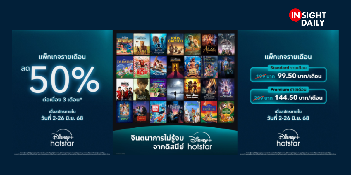 ครั้งแรกในไทย! Disney+ Hotstar จัดโปรแรงฝ่าฝน ลด 50% ให้ฟินฉ่ำ ๆ เสิร์ฟความคุ้มและความบันเทิงจัดเต็มทั้งหนังและซีรีส์คุณภาพระดับโลกแบบจุใจที่นี่ที่เดียว ลดทันที 50% สำหรับแพ็กเกจรายเดือน ต่อเนื่อง 3 เดือนเต็ม แพ็กเกจ Basic เหลือเพียง 99.50 บาท/เดือน และแพ็กเกจ Premium เหลือเพียง 144.50 บาท/เดือนเท่านั้น! ผู้ใช้ที่สมัครแพ็กเกจ Standard รายเดือนอยู่แล้วสามารถอัปเกรดเป็นแพ็กเกจ Premium ได้ในราคาครึ่งเดียวเช่นกัน บอกเลยว่าเกินคุ้ม สมัครได้ถึง 26 มิถุนายนนี้เท่านั้น รีบสมัครเลย!