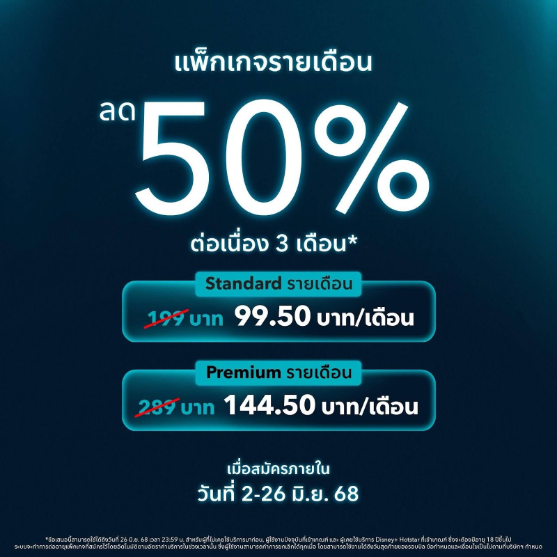 โปรโมชันพิเศษเดือนมิถุนายนนี้! Disney+ Hotstar แพ็กเกจรายเดือนลด 50% รับสิทธิ์ได้ต่อเนื่อง 3 เดือน โดยแพ็คเกจ Basic เหลือเพียง 99.50 บาทต่อเดือน และแพ็กเกจ Premium เหลือเพียง 144.50 บาทต่อเดือน สมัครได้ง่าย ๆ ทาง www.disneyplushotstar.com โดยกด “สมัครเลย” จากนั้นเลือกเข้าสู่ระบบด้วยเบอร์มือถือ (ได้ทุกเครือข่าย) ตั้งแต่วันที่ 2 – 26 มิถุนายน 2568 เวลา 23:59 น. รีบสมัครเลย แล้วมาสตรีมคอนเทนต์คุณภาพระดับโลกในราคาเพียงครึ่งเดียว