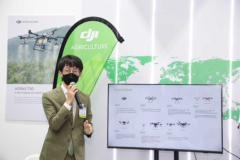 มิตเตอร์ดอนนี่ เจีย (MR. Donnie Jia) ผู้จัดการฝ่ายขาย ประเทศไทย DJI เปิดเผยว่า รัฐบาลไทยต้องการเพิ่มความสามารถในการแข่งขันในภาคเกษตรด้วยเทคโนโลยีและนวัตกรรม (NRAA, SDGs) จากสัดส่วน 9-10.5% GDP ประเทศไทย โดยมี 40% ของประชากรในนั้นเป็นเกษตรกร 60% จากจำนวนเกษตรกร13 ล้านคนปลูกข้าว และยังเป็นผู้ส่งออกทุเรียนอันดับ 1 ของโลก ปัจจุบันโดรนเกษตรเป็นเครื่องมือสำคัญที่เข้ามามีบทบาทในภาคการเกษตร รองรับกับความต้องการของประชากรโลกที่เติบโตอย่างต่อเนื่องจากความต้องการอาหารเพิ่มมากขึ้น รวมทั้งอุตสาหกรรมยังต้องเผชิญกับปัญหาการขาดแคลนแรงงานและการปฏิบัติงานแบบดั้งเดิมที่มีประสิทธิภาพต่ำ รวมถึงการขาดความรู้ในเทคโนโลยีใหม่เพื่อเพิ่มประสิทธิภาพการผลิต พร้อมด้วยต้นทุนที่มีราคาสูงและอาจก่อให้เกิดความเสี่ยงต่อสุขภาพได้ ดังนั้นเทคโนโลยีโดรนจะเข้ามามีบทบาทมากขึ้นในการจัดการกับความท้าทายขั้นพื้นฐานในขณะนี้ จึงนำไปสู่การเปลี่ยนแปลงการเกษตรแบบดั้งเดิม สู่การเกษตรสมัยใหม่ ที่เน้นการบริหารจัดการและใช้เทคโนโลยี นวัตกรรมหรือเรียกว่า สมาร์ทฟาร์ม เพื่อเพิ่มประสิทธิภาพให้การผลิต ประหยัดทรัพยากร และช่วยลดต้นทุนการทำเกษตร