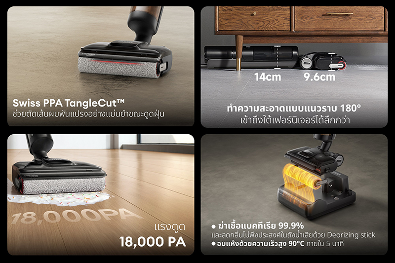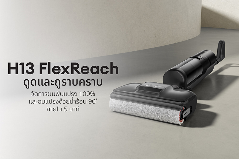 อีกหนึ่งเทคโนโลยีทำความสะอาดรุ่นล่าสุดจากดรีมมี H13 FlexReach เครื่องดูดและถูพื้นอัจฉริยะ ที่มาพร้อมพลังแรงดูดสูงถึง 18,000 Pa สามารถจัดการคราบสกปรกขนาดใหญ่ได้ในครั้งเดียว ด้วยความสามารถทำความสะอาดพื้นที่ได้กว้างถึง 300 ตารางเมตรต่อการชาร์จเพียง 1 ครั้ง ช่วยให้การทำความสะอาดสะดวกสบายมากยิ่งขึ้น โดดเด่นด้วยดีไซน์ที่สามารถทำความสะอาดในแนวราบได้ถึง 180 องศา เข้าถึงใต้เฟอร์นิเจอร์ได้ทุกซอกทุกมุม ไม่ว่าจะเป็นใต้เตียงนอน โซฟา โต๊ะหรือตู้ต่าง ๆ พร้อมล้อด้านหลังที่สามารถหมุนได้รอบทิศทางที่ช่วยป้องกันรอยขีดข่วนบนพื้นผิวขณะทำความสะอาด