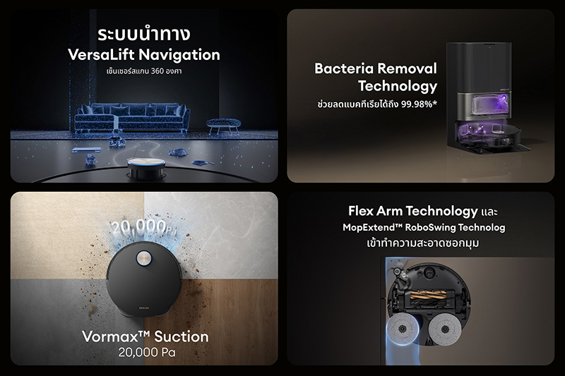 ทั้งยังมีระบบ HyperStream™ Detangling DuoBrush ที่ใช้แปรง TPU แบบคู่ ช่วยป้องกันเส้นผมพันแปรงและเพิ่มประสิทธิภาพในการทำความสะอาดทั้งพื้นกระเบื้องและพรม นอกจากนี้ยังมีเทคโนโลยีอื่นๆ อีกมากมายไม่ว่าจะเป็น OmniDirt™ 2.0 เซนเซอร์อัจฉริยะสำหรับตรวจจับคราบสกปรกฝังลึก พร้อมด้วย TripleUp Tech ระบบสลับโหมดอัตโนมัติระหว่างการดูดฝุ่นและถูพื้น และ AceClean DryBoard ฐานทำความสะอาดม็อบอัตโนมัติด้วยน้ำร้อน 80 องศา ที่ช่วยเพิ่มความมั่นใจในความสะอาดให้กับผู้ใช้งาน