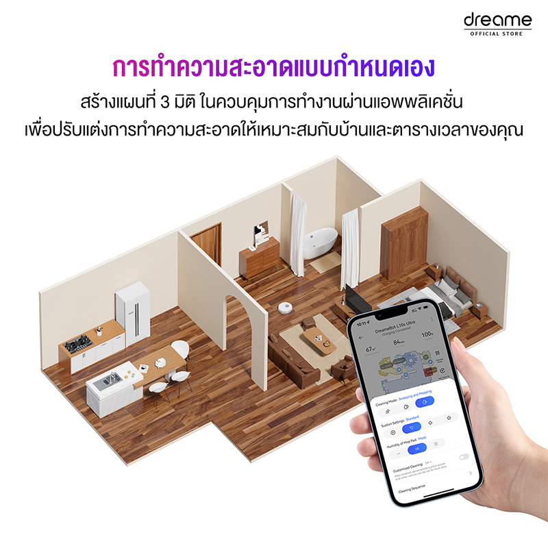 นอกจากกล่องเก็บฝุ่นจะสามารถเก็บฝุ่นไว้ในถุงเก็บฝุ่นเดียวได้ถึง 60 วันแล้ว L10s Ultra ยังสามารถรองรับการตั้งค่าการทำความสะอาดแบบกำหนดเองอีกด้วย เพียงดาวน์โหลดแอปพลิเคชัน Dreamehome (app.dreame.tech) จากนั้นทำการตั้งค่าหุ่นยนต์ทำความสะอาดให้เข้ากับความต้องการและกำหนดเวลาในการทำความสะอาดให้เหมาะกับพฤติกรรมการใช้ชีวิตของแต่ละบุคคล รวมทั้งสามารถปรับระดับน้ำ ความแรงในการดูดฝุ่น และสามารถตั้งค่าหุ่นยนต์ทำความสะอาดให้เป็นมิตรกับสิ่งแวดล้อมมากขึ้น