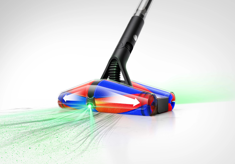 แถบแปรงทำความสะอาดด้านหน้าจะมีแกนหมุนสองแกนที่หมุนไปในทิศทางตรงข้ามกัน ซึ่งเพิ่มประสิทธิภาพในการดูดฝุ่น นอกจากนั้นยังมีแสงไฟสีเขียวทั้งสองด้าน หน้าและหลัง ที่เผยเศษฝุ่นที่มองเห็นได้ยาก ทำให้มั่นใจได้ว่าพื้นสะอาดหมดจดอย่างแท้จริง นอกจากนั้นตัวแกนหมุนยังถูกออกแบบให้ยื่นออกมาด้านข้างเล็กน้อย เพื่อทำความสะอาดขอบหรือมุมในบริเวณที่เข้าถึงยาก