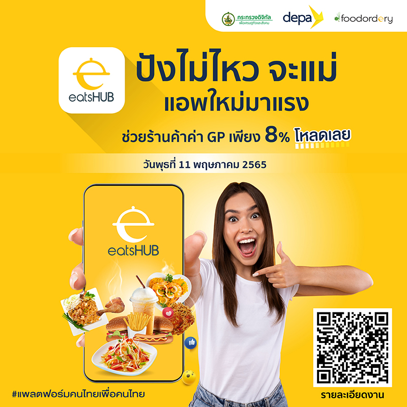 สำนักงานส่งเสริมเศรษฐกิจดิจิทัล (depa) และบริษัท ฟู้ด ออเดอรี่ จำกัด เตรียม เปิดตัว แอปพลิเคชัน “eatsHUB” แพลตฟอร์ม Food Delivery ภายใต้โครงการส่งเสริมการประยุกต์ใช้และสร้างการตระหนักรับรู้เพื่อขับเคลื่อนเศรษฐกิจยุควิถีใหม่ไปกับ National Delivery Platform ที่จะมาเสิร์ฟความคุ้มค่าให้กับเหล่าสายกิน และผู้ประกอบการ MSMEs ได้สัมผัสกับมาตรฐานใหม่แห่งวงการฟู้ด เดลิเวอรี่ ชูเก็บ GP เป็นธรรม ผู้ค้ามีกำไรมากขึ้น ในขณะที่ผู้บริโภคควักกระเป๋าซื้อในราคาสมเหตุสมผลได้ปริมาณอาหารคุ้มราคา ชนิดที่ไม่แตกต่างจากการไปรับประทานที่ร้าน การันตรีอิ่มเต็มคำ
