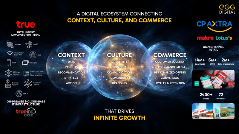 เอ้ก ดิจิทัล จึงร่วมกับ True Corporation และ CP AXTRA จัดงาน ‘EGG Digital Nexus: The Fusion Frontier’ เพื่อตอกย้ำพันธกิจที่มุ่งนำ AI และอินไซท์เชิงลึกมายกระดับอุตสาหกรรมไทยให้เติบโต ตามแนวคิด EGG Digital Infinity Loop of Growth เชื่อมต่อทุกจุดสัมผัสของธุรกิจและผู้บริโภคเข้ากับข้อมูลด้วยหลัก 5Cs (Connect, Create, Communicate, Convert, Curate) เพื่อสร้าง One Single View ที่นำไปสู่การสร้างประสบการณ์ Hyper-Personalized พร้อมสร้างคลื่นลูกใหม่ในการเติบโต (New Wave of Growth) ที่ไร้ขีดจำกัด”