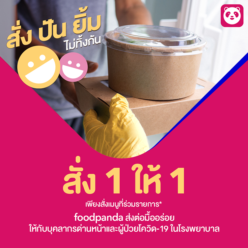 foodpanda จึงผุดแคมเปญ “สั่ง ปัน ยิ้ม ไม่ทิ้งกัน” สั่ง 1 ให้ 1 เพียงสั่งเมนูที่ร่วมรายการ foodpanda จะส่งต่อมื้ออร่อยให้กับบุคลากรด่านหน้าและผู้ป่วยโควิด-19 เชิญชวนให้ลูกค้าทุกท่านได้ร่วมช่วยเหลือสังคมกับ foodpanda และ 5 ร้านอาหารยอดนิยม อย่าง แมคโดนัลด์ เอ็มเค คัตสึยะ เปปเปอร์ ลันช์ และเท็กซัส ชิคเก้น แบบง่าย ๆ ทุกครั้งที่สั่งอาหารผ่าน foodpanda แค่ไปที่ ดีลพิเศษ “สั่ง ปัน ยิ้ม” สั่ง 1 ให้ 1 ก็จะได้พบกับเมนูที่ร่วมรายการจาก 5 ร้านอาหารพันธมิตร จากนั้นก็กดสั่งเมนูที่ร่วมแคมเปญ และเมนูอีก 1 ที่ จะถูกจัดส่งไปให้บรรดาฮีโร่ด่านหน้าและผู้ป่วยโควิด-19 ทั้งในโรงพยาบาล ศูนย์พักคอย และในชุมชนต่าง ๆ ได้อิ่มอร่อยด้วยเช่นกัน