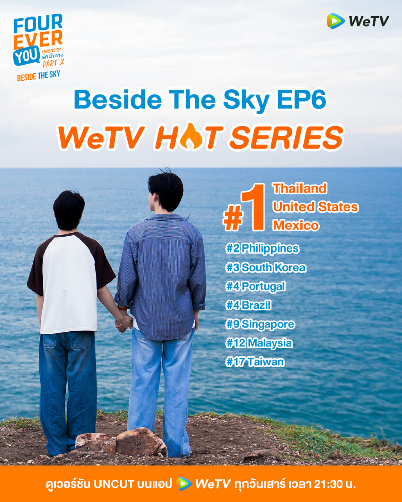 อีกหนึ่งผลงานกระแสแรง ฮอตตั้งแต่ต้นปี สำหรับซีรีส์วายโรแมนติก-คอมเมดี้ “Fourever You Part 2 : Beside The Sky ต้นฟ้าไต้ฝุ่น” ที่ยิ่งออนก็ยิ่งเสิร์ฟความฟินแฟน ๆ ไปทั่วไทม์ไลน์ เพราะด้วยเรื่องราวที่น่าติดตาม ดูเพลิน จนทำให้ซีรีส์ขึ้นแท่นอันดับ 1 WeTV HOT TV Series บน WeTV ในหลายประเทศ ทั้ง Thailand, United States และ Mexico ตอกย้ำกระแสฮิตแบบไวรัลข้ามประเทศ ขณะเดียวกันแฮชแท็ก #FoureverYou2EP6 ก็พุ่งแรงติดเทรนด์ X อันดับ 1 Thailand และอันดับ 2 Philippines กลายเป็นโมเมนต์ที่แฟน ๆ แชร์กันอย่างต่อเนื่อง