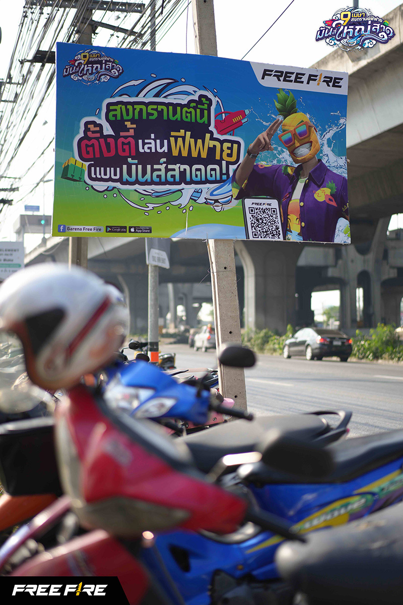 ไฮไลต์ที่ 2 ผุดไอเดียป้ายลูกนิมิตร สื่อสารด้วยข้อความชวนอ่าน สนุก ๆ ต่อ ๆ กัน แก้เบื่อช่วงรถติดระหว่าง เดินทางกลับบ้านช่วงสงกรานต์ กับป้าย Cut out เชิญชวนคนมาเล่น Free Fire คลายร้อน