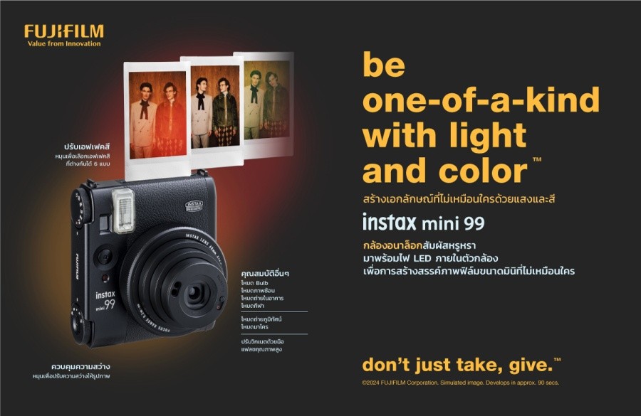 บริษัท ฟูจิฟิล์ม (ประเทศไทย) จำกัด เปิดตัวกล้องรุ่นใหม่ล่าสุด INSTAX mini 99TM (mini 99 TM) กล้องกลุ่มอินสแตนท์อนาล็อกระดับไฮเอนด์ โดยจะวางจำหน่ายในประเทศไทยวันที่ 4 เมษายน 2567 กล้อง mini 99™ เป็นรุ่นที่ยกระดับจากรุ่น INSTAX mini 90TM (mini 90TM) ซึ่งเป็นรุ่นที่เป็นที่ยอมรับทั่วโลก โดยมีคุณสมบัติใหม่ที่ใช้เทคโนโลยีอนาล็อกในการเพิ่มประสบการณ์การในการถ่ายภาพและสร้างสรรค์ภาพได้มากขึ้น