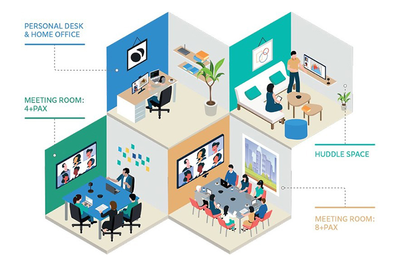 แทนที่จะต้องเสียเวลาไปหลายชั่วโมงกับการค้นหาผู้ขายหลายรายโดยใช้เครื่องมือและซอฟต์แวร์การทำงานร่วมกันหลายชิ้น แต่บัดนี้ธุรกิจทั้งหมดจะสามารถเข้าถึงชุดเครื่องมือและโซลูชันแบบบูรณาการที่มีตัวเลือกพื้นที่ทำงาน 4 แบบ ซึ่งจะตอบสนองความต้องการของธุรกิจแตกต่างกันไป ตั้งแต่โต๊ะทำงานส่วนตัว พื้นที่ขนาดเล็ก ห้องประชุมขนาด 4-8 คน และห้องประชุมขนาด 8 คนขึ้นไป