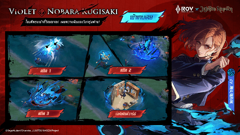 ความร่วมมือที่ทุกคนรอคอยกลับมาอีกครั้ง เมื่อ Megumi Fushiguro และ Nobara Kugisaki พร้อมเข้าร่วมสมรภูมิ RoV! ผู้เล่นสามารถควบคุมพลังงานต้องคำสาปของสองตัวละครชื่อดัง ผ่านฮีโร่อย่าง Paine และ Violet โดยปลดปล่อยวิชาเงาสิบร่างของ Megumi และวิชาหุ่นฟางของ Nobara เพื่อเอาชนะคู่ต่อสู้ รังสรรค์ท่วงท่าใน Jujutsu Kaisen อันเป็นเอกลักษณ์ให้เกิดขึ้นจริง! คอยติดตามรายละเอียดความร่วมมือและรางวัลพิเศษเพิ่มเติมได้ทาง Garena RoV Thailand