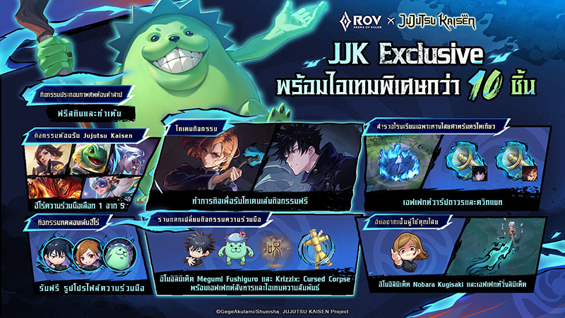 Arena of Valor (RoV) ประกาศความร่วมมือกับอนิเมะชื่อดัง “Jujutsu Kaisen” (มหาเวทย์ผนึกมาร) อีกครั้ง! กิจกรรมสุดพิเศษ ซึ่งเริ่มขึ้นตั้งแต่วันที่ 20 มีนาคม 2568 เป็นต้นไป จะมาพร้อมตัวละครจากความร่วมมือใหม่ล่าสุดและกิจกรรมในเกมสุดพิเศษ โดยตัวละครจาก Jujutsu Kaisen ที่หลายคนรอคอย อย่าง Megumi Fushiguro และ Nobara Kugisaki จะมาจุดประกายความตื่นเต้นของการต่อสู้คุณไสยเต็มรูปแบบ! นอกจากนี้ ผู้เล่นที่ทำภารกิจที่กำหนดสำเร็จในช่วงเวลากิจกรรม จะได้รับสกิน Krizzix: “Cursed Corpse” สุดพิเศษ ฟรี! ทั้งยังมีกิจกรรมแจกรางวัลในธีม Jujutsu Kaisen อีกมากมาย พร้อมเซอร์ไพรส์ผู้เล่นตลอดระยะเวลากิจกรรม ห้ามพลาด!