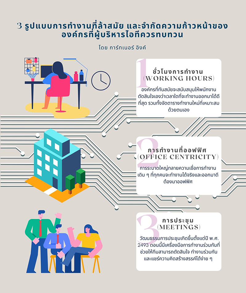 - การทำงานที่ออฟฟิศ (Office centricity) — การระบาดใหญ่ได้ทลายความเชื่อการทำงานเดิม ๆ ที่ทุกคนจะทำงานได้จริงและออกมาดีต้องมาออฟฟิศ และมีหัวหน้างานคอยสอดส่องดูแลช่วยเหลือควบคุมความคืบหน้าของงาน ปัจจุบันองค์กรธุรกิจส่วนใหญ่กำลังวางแผนปรับโหมดการทำงานไปสู่ไฮบริดเพื่อรองรับการทำงานในอนาคต และเข้าใจว่าพนักงานสามารถทำงานได้อย่างเต็มประสิทธิภาพจากระยะไกล สำหรับงานที่ต้องใช้ ‘สมาธิ’ ขณะที่ออฟฟิศยังเป็นสถานที่ที่เหมาะที่สุดสำหรับทำกิจกรรมร่วมกันบางอย่าง อาทิ สำหรับสร้างความสัมพันธ์และทำงานร่วมกัน