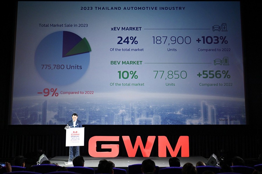 ในปี 2567 นี้ เกรท วอลล์ มอเตอร์ คาดว่าตลาดรถยนต์ไทยจะมียอดขายโดยประมาณทั้งสิ้น 820,000 คัน เพิ่มขึ้นจากปีที่ผ่านมาประมาณ 6% โดยกลุ่มรถยนต์พลังงานไฟฟ้าหรือกลุ่ม xEV จะเติบโตขึ้นประมาณ 40% หรือคิดเป็น 33 % ของตลาดทั้งหมด และมียอดขายประมาณ 270,000 คัน นอกจากนี้ รถยนต์ไฟฟ้า 100% จะยังคงเติบโตต่อเนื่องจากนโยบายการสนับสนุนของภาครัฐ EV 3.5 และการเข้ามาของแบรนด์ใหม่ ๆ โดยคาดการณ์ว่าประเทศไทยจะมียอดขายรถยนต์ไฟฟ้าในปี 2567 อยู่ที่ประมาณ 130,000 คัน หรือคิดเป็นสัดส่วน 16% ของตลาดรวมทั้งหมด เพิ่มขึ้นเกือบ 70% จากปี 2566 ที่ผ่านมา