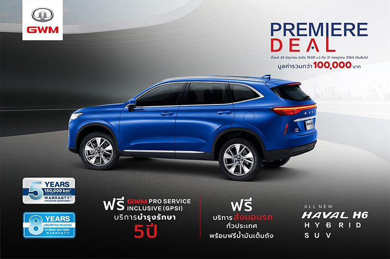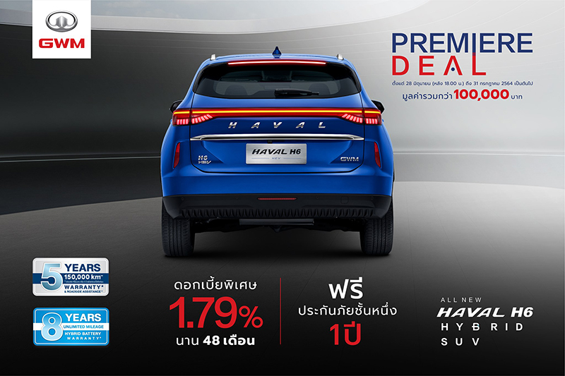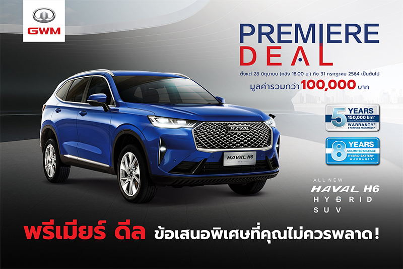 เกรท วอลล์ มอเตอร์ (Great Wall Motor – GWM) ขอบคุณการตอบรับอย่างอบอุ่นจากคนไทยที่มีต่อ All New HAVAL H6 Hybrid SUV พร้อมเดินเคียงข้างคนไทยในช่วงสถานการณ์ปัจจุบัน ด้วยการประกาศขยายระยะเวลาแคมเปญ PREMIERE DEAL ต่ออีก 1 เดือนเต็ม มอบความคุ้มค่ากับข้อเสนอสุดพิเศษให้แก่ลูกค้าตั้งแต่ 1 – 31 สิงหาคม 2564 ยืนยันเดินหน้าส่งมอบรถยนต์อัจฉริยะที่เต็มเปี่ยมไปด้วยประสบการณ์ขับขี่เหนือระดับ และบริการหลังการขายแบบครบวงจร