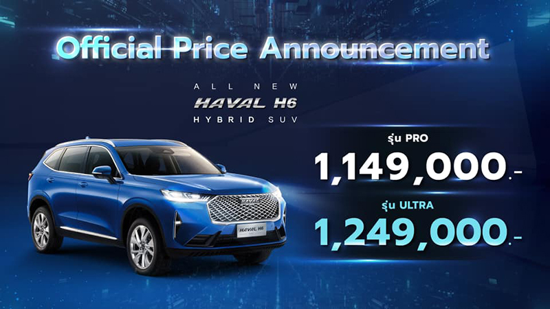 All New HAVAL H6 Hybrid SUV มี 2 รุ่นย่อย ได้แก่ รุ่น ULTRA ราคา 1,249,000 บาท และรุ่น PRO ราคา 1,149,000 บาท โดยเป็นราคาแบบ “ONE PRICE” ราคาเดียวเท่ากันในทุกช่องทางจำหน่าย ซึ่งทั้ง 2 รุ่น ยังมาพร้อมกับการรับประกันคุณภาพตัวรถและบริการช่วยเหลือฉุกเฉิน (Factory Warranty & Roadside Assistance) ที่จะทำให้ลูกค้าหมดกังวลในการใช้รถและการดูแลรักษาในระยะยาว ครอบคลุมระยะเวลา 5 ปี หรือระยะทาง 150,000 กิโลเมตร และการรับประกันแบตเตอรี่แบบไม่จำกัดระยะทางนานถึง 8 ปีเต็ม