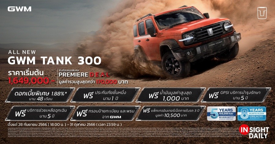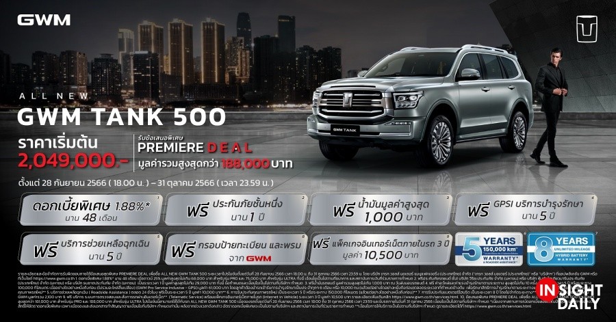และการรับประกันแบตเตอรี่ไฮบริด 8 ปี ไม่จำกัดระยะทาง นอกจากนี้ รถยนต์ทั้งสองรุ่น ยังมาพร้อมข้อเสนอสุดพิเศษมากมาย ไม่ว่าจะเป็น ฟรี ประกันภัยชั้นหนึ่ง 1 ปี ฟรี ค่าอะไหล่และค่าแรงบํารุงรักษาตามระยะทาง GWM Pro Service Inclusive – GPSI สูงสุด 10 ครั้ง ภายใน 5 ปีหรือ 100,000 กิโลเมตร แล้วแต่อย่างใดอย่างหนึ่งถึงก่อน (ไม่รวมอะไหล่สิ้นเปลือง) ฟรี บริการช่วยเหลือฉุกเฉิน (Roadside Assistance ) ตลอด 24 ชั่วโมง ระยะเวลา 5 ปี ฟรี บริการระบบตรวจสอบและสั่งการรถผ่านอินเทอร์เน็ต* (Telematic Service) พร้อมแพ็กเกจอินเทอร์เน็ตภายในรถ (Internet in Vehicle) ระยะเวลา 3 ปี รวมถึงสิทธิพิเศษกับการเป็นส่วนหนึ่งของ GWM TANK CLUB และกิจกรรมสุดพิเศษมากมาย