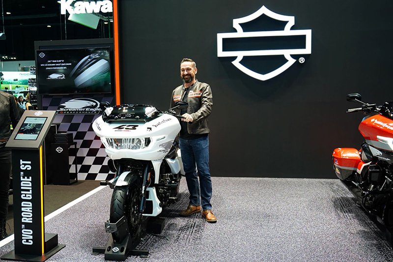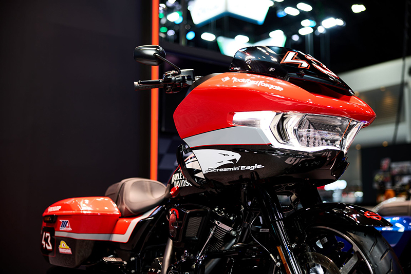 สัมผัสความเร้าใจของรถมอเตอร์ไซค์ Bagger ที่เร็ว แรง และล้ำสมัยที่สุดเท่าที่ Harley-Davidson เคยสร้างมา รถมอเตอร์ไซค์รุ่น CVO Road Glide ST ขับเคลื่อนด้วยเครื่องยนต์ทรงพลัง 135 Screamin’ Eagle Crate Engine พัฒนาขึ้นจากชิ้นส่วนประกอบเครื่องยนต์สมรรถนะสูง และหนึ่งในไฮไลท์สำคัญที่บูธ Harley-Davidson คือ รถมอเตอร์ไซค์รุ่น CVO Road Glide ST หมายเลข 43 ซึ่งได้รับแรงบันดาลใจจากรถมอเตอร์ของนักแข่งตัวจริงอย่าง เจมส์ ริสโปลี พร้อมถ่ายทอดจิตวิญญาณแห่งการแข่งจากรายการ King of the Baggers™ มาพร้อมกับเครื่องยนต์ขนาด 135 ลูกบาศก์นิ้ว Screamin’ Eagle Crate Engine ออกแบบมาให้เร่งความเร็วได้เต็มกำลังที่รอบเครื่องยนต์สูงพร้อมส่งพลังให้เร่งแซงได้ฉับไว เหมาะสำหรับนักขับขี่ที่มองหารถมอเตอร์ไซค์กระบอกสูบใหญ่ที่มาพร้อมกำลังอัดและระบบส่งกำลังที่ยอดเยี่ยม ตัวรถยังสามารถส่งแรงบิดมหาศาลไปยังล้อหลังได้ทันทีเมื่อเปิดคันเร่ง เสริมสไตล์ผู้ขับขี่ให้ดุดันด้วยเบาะนั่งเดี่ยวและไรเซอร์แฮนด์บาร์ขนาด 6 นิ้ว โดดเด่นด้วยคัสตอมสไตล์ West Coast