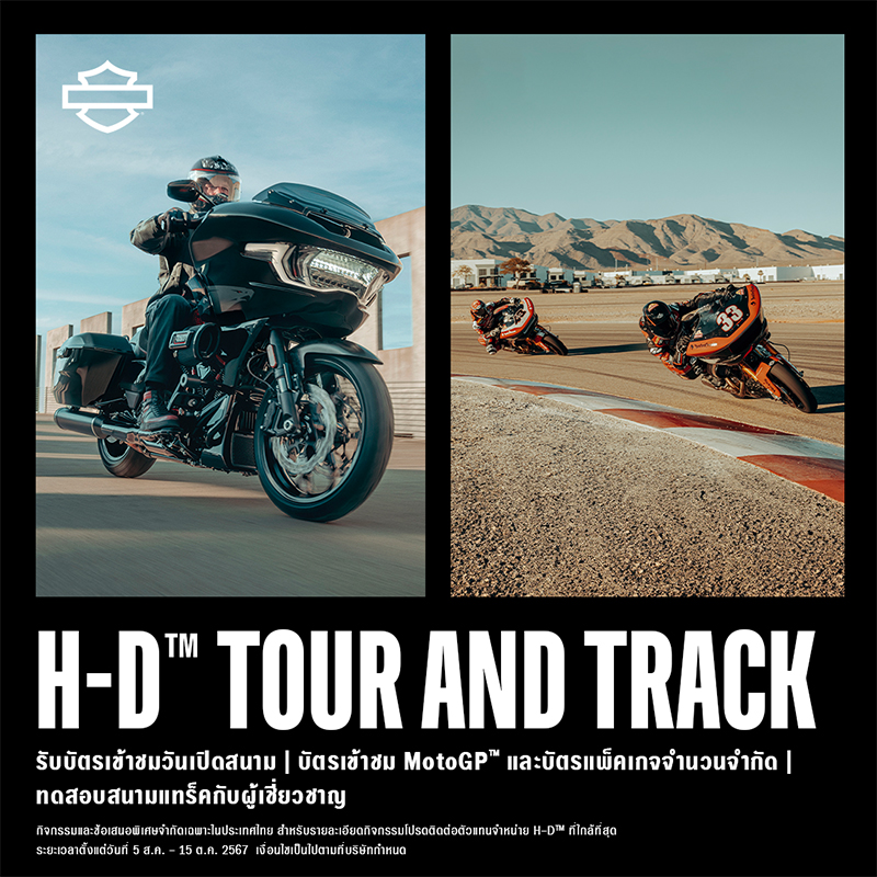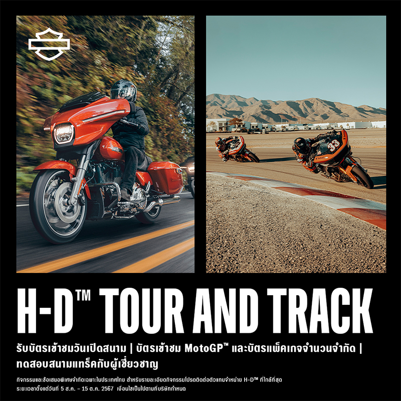 ในโอกาสฉลองตำนานรถมอเตอร์ไซค์ตระกูล Grand American Touring Harley-Davidson จัดแคมเปญ Tour & Track เพื่อให้เหล่านักขับขี่ที่เป็นเจ้าของ หรือผู้ที่ลงทะเบียนทดลองขับขี่รถมอเตอร์ไซค์ Harley-Davidson ตระกูล Grand American Touring ได้มาร่วมชมการแข่งขันโมโตจีพี (MotoGP™) ณ จังหวัดบุรีรัมย์ ระหว่างวันที่ 25 – 27 ตุลาคมนี้
