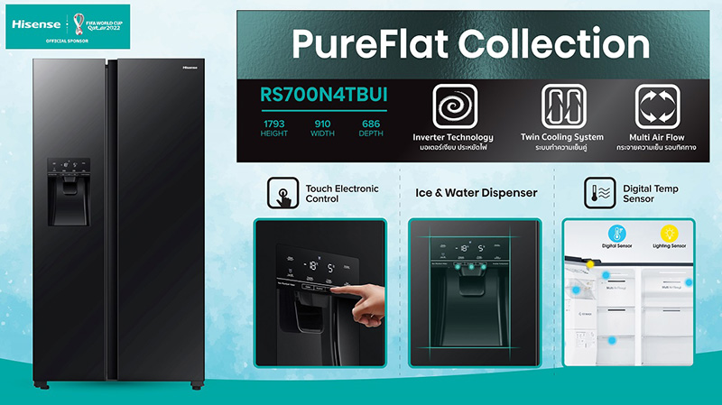 หากพูดถึงอุณหภูมิในประเทศไทยแล้ว ตู้เย็นถือเป็นเครื่องใช้ไฟฟ้าที่สำคัญมากสำหรับทุกบ้าน ตู้เย็นแบบเก่ามักจะมีน้ำแข็งเกาะ ส่งผลให้การทำความเย็นไม่ดีเท่าที่ควรและยังใช้พลังงานสูง ไฮเซ่นส์ (Hisense) จึงได้พัฒนาตู้เย็น Hisense รุ่น RS700 ให้มีการทำความเย็นแบบใช้ลม รวดเร็ว และใช้พลังงานต่ำมาก ออกแบบการใช้พื้นที่ในตู้เย็นด้วยการแบ่งสัดส่วนสำหรับสมาชิกแต่ละคนได้มีพื้นที่ของตัวเอง เช่น การจัดเก็บปลาทะเลน้ำลึก การจัดเก็บเฉพาะผักและผลไม้ น้ำนมแม่ และอาหารเสริมสำหรับทารก เครื่องสำอาง ไวน์แดง และอื่น ๆ
