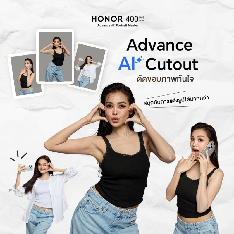 เมื่อกล้องที่คมชัดอาจยังไม่เพียงพอสำหรับภาพถ่าย HONOR 400 Series จึงมอบฟีเจอร์ Advance AI ที่ช่วยทำหน้าที่เหมือนผู้ช่วยหลังกล้อง ด้วยฟีเจอร์ Advance AI Cutout & Advance AI Cutout 2.0 ช่วยให้ผู้ใช้สามารถเลือกและย้ายวัตถุในภาพได้อย่างอิสระ โดยระบบจะเติมพื้นที่ที่ถูกย้ายออกให้อัตโนมัติ เพื่อให้ดูสมจริงราวกับว่าวัตถุนั้นไม่เคยอยู่ตรงนั้นมาก่อน เหมาะสำหรับการจัดวางองค์ประกอบภาพใหม่หรือปรับปรุงภาพให้ลงตัวมากขึ้น, Advance AI Eraser และ Advance AI Erase Passers-by ที่ช่วยลบวัตถุหรือคนที่ไม่ต้องการออกจากภาพได้อย่างแนบเนียนและรวดเร็ว, Advance AI Remove Reflection ที่ลบแสงสะท้อนจากกระจกหรือแฟลชได้อย่างมีประสิทธิภาพ เหมาะสำหรับสายคาเฟ่ที่มักถ่ายรูปผ่านกระจกสวยๆ ในร้าน, Advance AI Outpainting สำหรับขยายภาพถ่ายให้ภาพดูสมบูรณ์แบบยิ่งขึ้น, รวมถึง Advance AI Upscale ที่ฟื้นฟูภาพเก่าให้กลับมาคมชัดราวภาพใหม่ในคลิกเดียว