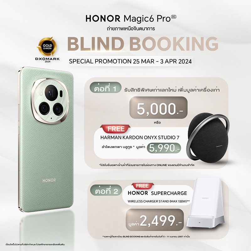 พิเศษ! สำหรับผู้ที่สนใจสมาร์ตโฟน HONOR Magic 6 Pro พบกับกิจกรรมต้อนรับการเปิดตัวรุ่นใหม่ล่าสุด Blind Booking Now กับ สมาร์ตโฟนอันดับ 1 สายกล้อง! เพียงลงทะเบียน Blind Booking ผ่านทาง bit.ly/Magic6ProBlindBooking ตั้งแต่วันนี้ – 3 เมษายน 2567 รับฟรี! สิทธิพิเศษมากมาย ต่อที่ 1 รับสิทธิ์นำเครื่องเก่ามาแลกเครื่องใหม่ ในมูลค่าสูงถึง 5,000 บาท* หรือเลือกรับฟรี! ลำโพง Harman Kardon Onyx Studio7 มูลค่า 5,990 บาท* ต่อที่ 2 รับฟรี! HONOR SuperCharge Wireless Charger Stand มูลค่า 2,499 บาท* โปรโมชันนี้เฉพาะร้านค้าออนไลน์ที่ร่วมรายการเท่านั้น สิทธิพิเศษมีจำนวนจำกัด