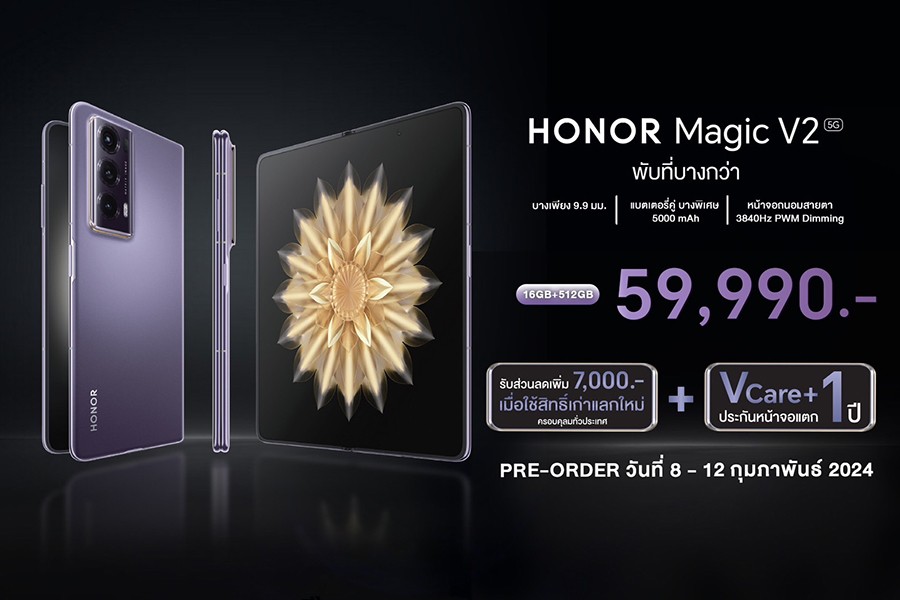 ออเนอร์ (HONOR) ผู้ให้บริการอุปกรณ์อัจฉริยะชั้นนำระดับโลก เดินหน้ารุกตลาดสมาร์ตโฟนจอพับในประเทศไทย หวังขยายตลาดในกลุ่มระดับไฮเอนด์ ประกาศเปิดตัวสมาร์ตโฟนจอพับระดับแฟลกชิป “HONOR Magic V2” ภายใต้สโลแกน “พับที่บางกว่า – Foldable Ultra Slim” ด้วยการมอบประสบการณ์การใช้งานที่ดีที่สุด พร้อมชูจุดขายด้วยดีไซน์เหนือชั้นที่บางและเบา ตัวเครื่องบางเพียง 9.9 มิลลิเมตร ขณะพับหน้าจอ และบางเพียง 4.7 มิลลิเมตร เมื่อกางออก ซึ่งเป็นสมาร์ตโฟนจอพับเพียงหนึ่งเดียวที่บางกว่าสมาร์ตโฟนทั่วไปบางรุ่นในตลาดปัจจุบัน ผสานการใช้งานที่สมบูรณ์แบบต่อเนื่องยาวนานด้วยแบตเตอรี่คู่ซิลิคอนคาร์บอนขนาดใหญ่ 5000mAh มาพร้อมหน้าจอถนอมสายตาขนาดใหญ่ 7.92 นิ้ว ตอบโจทย์การรับชมคอนเทนต์ความบันเทิงได้อย่างสบายตาและเต็มอรรถรส เปิดตัวในราคา 59,990 บาท พร้อมโปรโมชันพิเศษช่วงพรีออเดอร์ในวันที่ 8 – 12 กุมภาพันธ์ 2567 และเริ่มจำหน่ายตั้งแต่วันที่ 13 กุมภาพันธ์ 2567 เป็นต้นไป