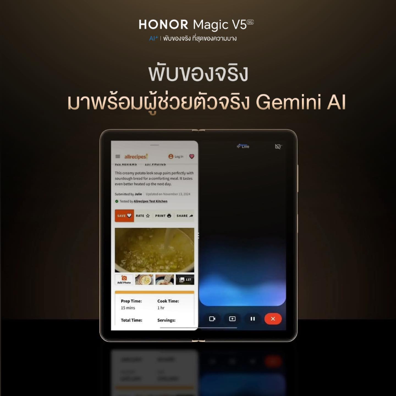ถ้าสมาร์ตโฟนสามารถอำนวยความสะดวกคุณได้มากกว่าที่คิด… ชีวิตจะง่ายขึ้นแค่ไหน? ในยุคที่ AI เริ่มเข้ามามีบทบาทสำคัญในการใช้ชีวิตประจำวัน และการทำงาน การมีสมาร์ตโฟนที่ “ฉลาดจริง ช่วยคุณได้จริง” ไม่ใช่เรื่องไกลตัวอีกต่อไป HONOR Magic V5 มาเพื่อตอบโจทย์นี้อย่างแท้จริง ด้วยการผนึกพลังระหว่าง HONOR AI ที่ออกแบบเฉพาะสำหรับผู้ใช้ กับ Google Gemini สุดล้ำแห่งวงการ AI ทำให้ทุกการใช้งานไม่เพียงแค่ตอบสนอง แต่คาดเดาและช่วยเหลือได้อย่างเหนือชั้น