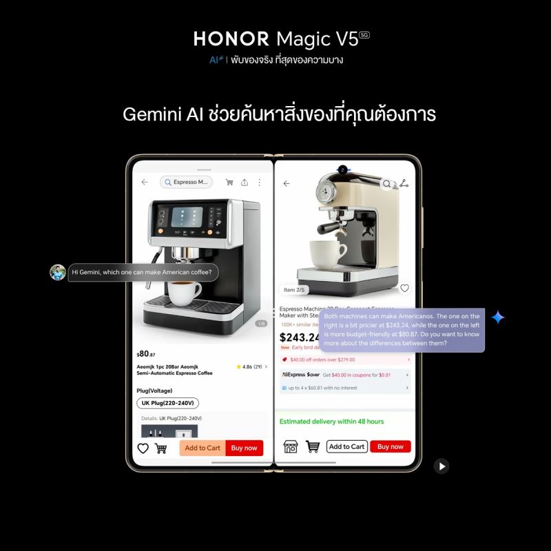 HONOR Magic V5 ไม่ได้เป็นเพียงสมาร์ตโฟนพับได้บางที่สุดในโลกเท่านั้น แต่ยังมาพร้อม Google Gemini ผู้ช่วย AI อัจฉริยะที่ติดตั้งมาในเครื่อง ช่วยให้ผู้ใช้งานทำงาน วางแผน และจัดการชีวิตประจำวันได้ง่ายขึ้นอย่างที่ไม่เคยมีมาก่อน ไม่ว่าคุณจะกำลังร่างเอกสาร คิดไอเดียใหม่ ๆ หรือจัดตารางเวลาที่แน่นสุด ๆ เพียงพูดคุยกับ Gemini ก็สามารถเสริมทั้งความคิดสร้างสรรค์และประสิทธิภาพการทำงานได้ทันที