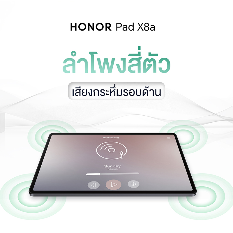 HONOR Pad X8a มอบประสบการณ์เสียงสุดเหนือชั้น ด้วยระบบลำโพงแอมพลิจูดขนาดใหญ่สี่ตัว ผสานเทคโนโลยี HONOR Histen Sound Tuning และการรับรอง Dual Hi-Res ทำให้เสียงมีมิติที่หลากหลาย ทั้งเสียงสูงที่คมชัด เสียงกลางที่ประณีต และเสียงเบสที่หนักแน่น อีกทั้งยังออกแบบมาเพื่อให้ทุกคนได้สัมผัสกับเสียงระดับพรีเมียมที่ชัดเจน และมีคุณภาพเสียงที่ไม่มีใครเทียบได้ ด้วยการรับรองเสียงความละเอียดสูงทั้งแบบมีสายและไร้สาย ทำให้มั่นใจได้ว่าจะได้ยินเสียงที่สมจริง ราวกับมีชีวิตในทุกเนื้อหา ไม่ว่าจะฟังเพลง ชมวิดีโอ หรือเล่นเกมแอคชั่น HONOR Pad X8a จะมอบคุณภาพเสียงที่ดีที่สุดในระดับเดียวกันและสร้างประสบการณ์เสียงที่สนุกสนานอย่างทั่วถึงสำหรับผู้ใช้ทุกคน