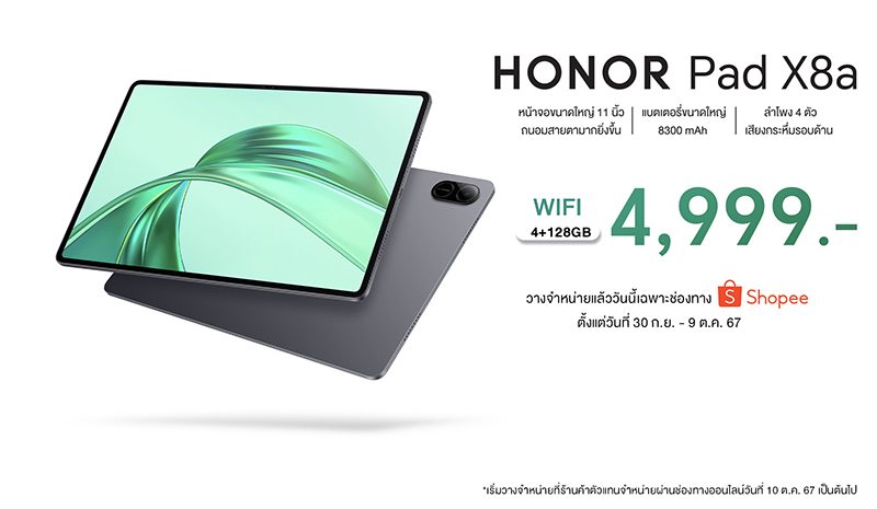 ออเนอร์ (HONOR) ผู้ให้บริการอุปกรณ์อัจฉริยะชั้นนำระดับโลก เปิดตัวแท็บเล็ตรุ่นใหม่ HONOR Pad X8a อย่างเป็นทางการในประเทศไทย พร้อมส่งมอบประสบการณ์ที่ครบครันทุกฟังก์ชันทั้งการทำงานและด้านความบันเทิง จัดเต็มกับคุณสมบัติที่โดดเด่นเกินราคา ไม่ว่าจะเป็นจอแสดงผลขนาดใหญ่ 11 นิ้ว ที่ให้ภาพคมชัดเต็มตา แบตเตอรี่ขนาดใหญ่ความจุ 8300mAh ที่ใช้งานได้ยาวนานตลอดทั้งวัน และลำโพงดังกระหึ่มถึง 4 ตัว พร้อมเทคโนโลยี HONOR Histen Sound Tuning และการรับรอง Dual Hi-Res ทำให้ได้คุณภาพเสียงที่น่าหลงใหลและสมจริง นอกจากนี้ตัวเครื่องยังออกแบบมาให้มีความบางและเบา เพื่อให้พกพาง่ายพร้อมใช้งานได้ทุกที่ทุกเวลา สามารถเป็นเจ้าของ HONOR Pad X8a ในราคาคุ้มค่า โดยมีให้เลือก 2 รุ่น ได้แก่ HONOR Pad X8a WIFI ราคา 4,999 บาท และ HONOR Pad X8a LTE ราคา 5,999 บาท