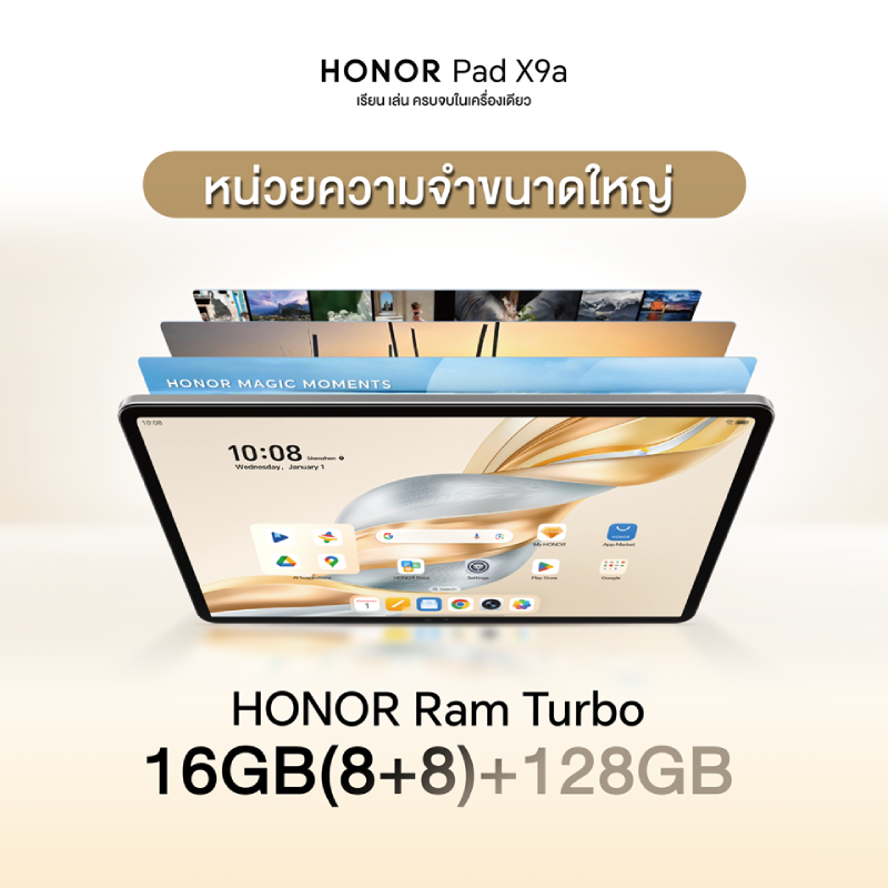 HONOR Pad X9a มาพร้อมแรม 8GB และพื้นที่เก็บข้อมูลภายใน 128GB พร้อมเทคโนโลยี HONOR RAM Turbo ที่สามารถเพิ่มประสิทธิภาพ RAM ได้สูงสุดถึง 16GB* แม้ว่า iPad รุ่นเริ่มต้นจะมีแรม 4GB และหน่วยความจำเริ่มต้นที่ 64GB ทำให้ HONOR Pad X9a มีข้อได้เปรียบอย่างชัดเจนในด้านนี้ สำหรับผู้ที่ต้องการพื้นที่เพิ่มเติม รุ่น LTE ยังรองรับการขยายพื้นที่จัดเก็บผ่าน MicroSD Card ได้สูงสุดถึง 1TB ซึ่งเป็นฟีเจอร์ที่ iPad ไม่มี