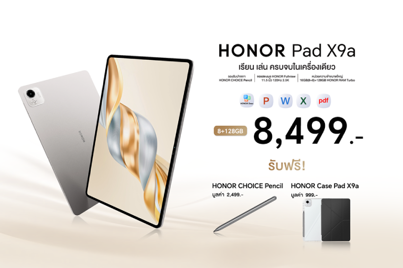ไม่ว่าคุณจะเป็นนักเรียน นักศึกษา มืออาชีพ หรือผู้ที่ชื่นชอบความบันเทิง HONOR Pad X9a พร้อมตอบโจทย์ทุกการใช้งานของคุณ วางจำหน่ายแล้ววันนี้ในราคาเพียง 8,499 บาท พิเศษ! เมื่อซื้อ HONOR Pad X9a รับฟรีปากกา HONOR CHOICE Pencil มูลค่า 2,499 บาท และเคส HONOR Case Pad X9a มูลค่า 999 บาท รวมของแถมมูลค่าสูงถึง 3,498 บาท ที่ HONOR Experience Store ทุกสาขา และตัวแทนจำหน่ายทั่วประเทศ รวมถึงแพลตฟอร์มออนไลน์ Shopee, Lazada และ TikTok Shop อย่ารอช้า! ร่วมสัมผัสประสบการณ์แท็บเล็ตแห่งอนาคตกับ HONOR Pad X9a ได้แล้ววันนี้