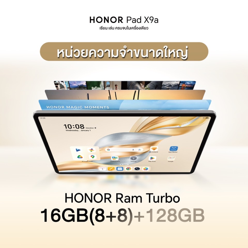 HONOR Pad X9a มาพร้อมหน่วยความจำ RAM ขนาด 8GB และพื้นที่เก็บข้อมูลภายใน 128GB รองรับการใช้งานได้อย่างครอบคลุมทุกด้าน ไม่ว่าจะเป็นการจัดเก็บไฟล์ภาพถ่าย เพลง วิดีโอความละเอียดสูง หรือเอกสารสำคัญ โดยไม่ต้องกังวลว่าเครื่องจะเต็มเร็ว อีกทั้งยังมาพร้อมเทคโนโลยี HONOR RAM Turbo ที่สามารถเพิ่มประสิทธิภาพ RAM ได้สูงสุดถึง 16GB* ช่วยให้การทำงานแบบมัลติทาสก์เป็นไปอย่างลื่นไหล ไม่สะดุด นอกจากนี้ ยังรองรับการขยายพื้นที่จัดเก็บเพิ่มเติมผ่าน MicroSD Card ได้สูงสุดถึง 1TB (เฉพาะรุ่น LTE – การ์ดหน่วยความจำจำหน่ายแยกต่างหาก) เพื่อตอบโจทย์ทุกไลฟ์สไตล์การใช้งาน ไม่ว่าจะเป็นการเรียน การทำงาน หรือความบันเทิง ทั้งการดาวน์โหลดแอปพลิเคชัน ดูหนัง ฟังเพลง หรือเล่นเกม ก็สามารถทำได้อย่างอิสระ โดยไม่ต้องลบไฟล์บ่อย ๆ อีกต่อไป