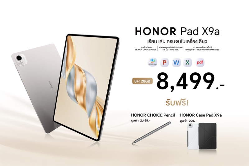 พิเศษ! เมื่อซื้อ HONOR Pad X9a รับฟรีปากกา HONOR CHOICE Pencil มูลค่า 2,499 บาท และเคส HONOR Case Pad X9a มูลค่า 999 บาท ผู้สนใจสามารถดูรายละเอียดเพิ่มเติมได้ที่เว็บไซต์ www.honor.com/th หรือติดตามข่าวสารและกิจกรรมได้ที่เฟซบุ๊ก HONOR Thailand