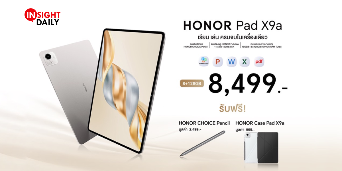 พิเศษ! เมื่อซื้อ HONOR Pad X9a รับฟรีปากกา HONOR CHOICE Pencil มูลค่า 2,499 บาท และเคส HONOR Case Pad X9a มูลค่า 999 บาท ผู้สนใจสามารถดูรายละเอียดเพิ่มเติมได้ที่เว็บไซต์ www.honor.com/th หรือติดตามข่าวสารและกิจกรรมได้ที่เฟซบุ๊ก HONOR Thailand