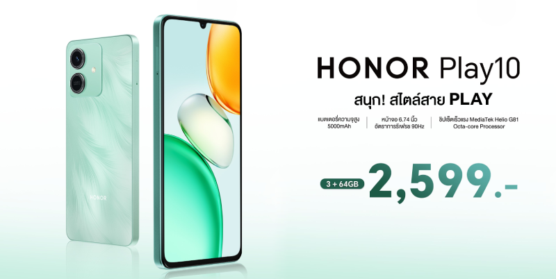นอกจากการเปิดตัว HONOR X5c Plus แล้ว HONOR ยังเสริมทัพสมาร์ตโฟนรุ่นคุ้มค่าอีกหนึ่งรุ่นที่น่าจับตามองอย่าง HONOR Play 10 ภายใต้คอนเซ็ปต์ ‘สนุก สไตล์สายเพลย์’ ที่ออกแบบมาเพื่อตอบโจทย์ผู้ใช้งานที่มองหาความคุ้มค่า ควบคู่กับประสิทธิภาพที่เพียงพอต่อการใช้งานในชีวิตประจำวัน