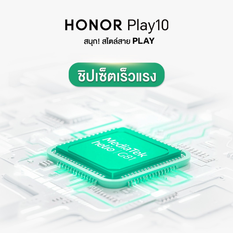 อีกหนึ่งหัวใจสำคัญของ HONOR Play 10 คือชิปเซ็ตประมวลผล MediaTek Helio G81 แบบ Octa-core ที่ออกแบบมาเพื่อให้การทำงานมีความรวดเร็วและเสถียร รองรับการใช้งานหลากหลายรูปแบบ ไม่ว่าจะเป็นการสื่อสาร ความบันเทิง หรือกิจกรรมในชีวิตประจำวันได้อย่างลงตัว พร้อมเสริมประสบการณ์การถ่ายภาพด้วย กล้องหลัง Super Clear Camera ความละเอียด 13MP และกล้องหน้า 5 ล้านพิกเซล เพื่อการบันทึกภาพที่คมชัดในทุกโมเมนต์สำคัญ นอกจากนี้ ยังให้ความสำคัญกับความปลอดภัยและความสะดวกสบายด้วย Dual Unlock Methods รองรับการปลดล็อกถึง 2 รูปแบบ ทั้งการสแกนลายนิ้วมือที่ปุ่มด้านข้าง (Side-mounted Fingerprint) และการสแกนใบหน้า (Face Unlock)