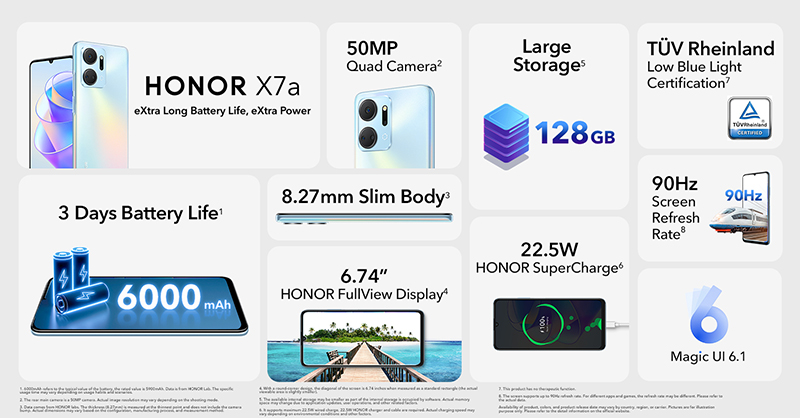 ทั้งนี้ ทาง HONOR ยังการันตีคุณภาพด้วยบริการหลังการขาย Trusted by Synnex กว่า 11 ศูนย์บริการทั่วประเทศ พร้อมบริการ Door to Door Service ผ่านเบอร์ติดต่อ 1251 ที่ให้ลูกค้ามั่นใจหายห่วงตลอดการใช้งานอย่างแน่นอน โดย HONOR X7a เปิดจำหน่ายทั้งหมด 3 สีได้แก่ Titanium Silver, Ocean Blue และ Midnight Black ให้ทุกท่านได้เป็นเจ้าของในราคาสุดคุ้มค่าเพียง 5,999 บาท แล้ววันนี้ บนแพลตฟอร์ม Shopee และ Lazada รวมถึงร้านค้าตัวแทนจำหน่าย HONOR ที่ร่วมรายการทั่วประเทศ และช่องทางร้านค้าออนไลน์ทุกแพลตฟอร์ม