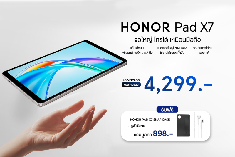 เป็นเจ้าของ HONOR Pad X7 ได้ในราคาเพียง 4,299 บาท วางจำหน่ายตั้งแต่วันที่ 23 ตุลาคม 2568 เป็นต้นไป พร้อมรับฟรี HONOR Pad7 Snap Case และ Wired Earphone รวมมูลค่า 898 บาท