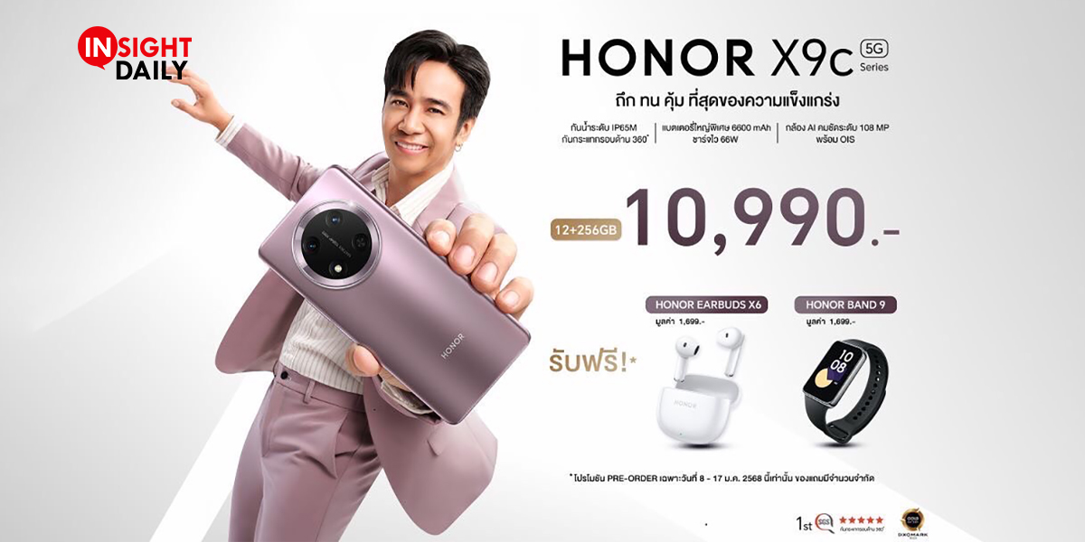 ออเนอร์ (HONOR) ผู้ให้บริการอุปกรณ์อัจฉริยะชั้นนำระดับโลก เดินหน้ารุกตลาดสมาร์ตโฟนไทย ประกาศเปิดตัว HONOR X9c 5G อย่างเป็นทางการ ภายใต้สโลแกน “ถึก ทน คุ้ม ที่สุดของความแข็งแกร่ง” ชูจุดเด่นด้วยความทนทานเหนือชั้น รองรับการกระแทกรอบด้าน 360 องศา พร้อมกันน้ำระดับ IP65M ผสานแบตเตอรี่ความจุ 6600mAh ระบบชาร์จไว 66W ตลอดจนสัมผัสกับประสบการณ์ถ่ายภาพเหนือระดับด้วย AI Camera อัจฉริยะ ความละเอียด 108MP และระบบป้องกันภาพสั่นไหว (OIS) ที่ช่วยให้ถ่ายภาพและวิดีโอคมชัดในทุกสภาพแสง เปิดตัวในราคา 10,990 บาท* พร้อมสร้างสีสันด้วยการคว้า “ก้อง ห้วยไร่” นั่งแท่น HONOR’s friend คนแรก