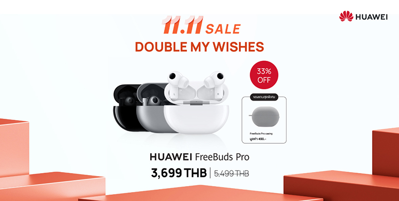 - HUAWEI FreeBuds Pro หูฟังไร้สายสุดโปร มาพร้อมเทคโนโลยีตัดเสียงรบกวนรอบข้าง Active Noise Cancellation แบบไดนามิกอัจฉริยะ รองรับการเชื่อมต่อสองอุปกรณ์ได้พร้อมกัน ที่ผสานพลังไมโครโฟน 3 ตัว ตัดเสียงรบกวนได้สูงสุดถึง 40 เดซิเบล พร้อมโหมด Awareness ที่สามารถสลับไปรับฟังเสียงคนรอบข้างได้โดยไม่ต้องถอดหูฟังออก ลดราคา 33% เหลือเพียง 3,699 บาท จากราคาปกติ 5,499 บาท เมื่อสั่งซื้อสินค้าผ่านทางเว็บไซต์ HUAWEI Store และร้านค้าอย่างเป็นทางการของหัวเว่ยใน Shopee และ Lazada ในวันที่ 11 พฤศจิกายน 2564 เท่านั้น