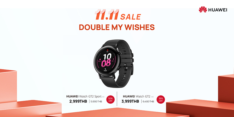 - HUAWEI WATCH GT 2e สมาร์ทวอชท์แบตอึดสำหรับคนรักสุขภาพและการออกกำลังกาย ใช้งานต่อเนื่องได้นานสูงสุด 2 สัปดาห์ คอยติดตามสุขภาพและการออกกำลังกายแบบมืออาชีพ โดย HUAWEI WATCH GT 2e ลดราคาสูงถึง 44% เหลือเพียง 2,790 บาท จากราคาปกติ 4,990 บาท เมื่อสั่งซื้อสินค้าผ่านทางเว็บไซต์ HUAWEI Store และร้านค้าอย่างเป็นทางการของหัวเว่ยใน Shopee และ Lazada ในวันที่ 11 พฤศจิกายน 2564 เท่านั้น