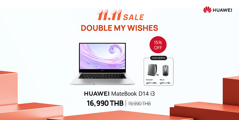 - HUAWEI MateBook D 14 i3 แล็ปท็อปหน้าจอคมชัดเต็มตาแบบ HUAWEI FullView Display ขนาด 14 นิ้ว สัดส่วนหน้าจอต่อตัวเครื่องอยู่ที่ 84% บอดี้ใช้วัสดุอลูมิเนียมทำให้น้ำหนักเบาแค่ 38 กก. และบางเพียง 15.9 มม. เหมาะสำหรับการพกพาไปด้วยทุกที่ พร้อมการล็อกอินเข้าใช้งานเครื่องง่ายๆ ผ่าน Fingerprint Power Button แถมยังรองรับการชาร์จเร็ว ตอนนี้ลดราคา 15% เหลือเพียง 16,990 บาท จากราคาปกติ 19,990 บาท พร้อมรับทันทีกระเป๋าใส่แล็ปท็อป มูลค่า 1,090 บาท และเม้าส์ มูลค่า 1,190 บาท เมื่อสั่งซื้อสินค้าผ่านทางเว็บไซต์ HUAWEI Store ระหว่างวันที่ 4 พฤศจิกายน 2564 ถึง 11 พฤศจิกายน 2564