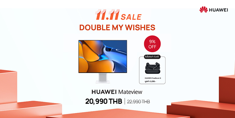 - HUAWEI MateView หน้าจอความละเอียดระดับ 4K+ Ultra-HD ขนาด 2 นิ้ว คมชัด ทำงานก็ได้ เล่นเกมก็ดี ดูหนังก็เลิศ แถมยังเชื่อมต่ออุปกรณ์สมาร์ทดีไวซ์ต่างๆ ใน ecosystem ของหัวเว่ยได้แบบไร้สาย ลดราคา 9% เหลือ 20,990 บาท จากราคาปกติ 22,990 บาท พร้อมรับทันทีหูฟัง HUAWEI FreeBuds 3i มูลค่า 3,299 บาท พร้อมเคสมูลค่า 490 บาท เมื่อสั่งซื้อสินค้าผ่านทางเว็บไซต์ HUAWEI Store ระหว่างวันที่ 4 พฤศจิกายน 2564 ถึง 11 พฤศจิกายน 2564