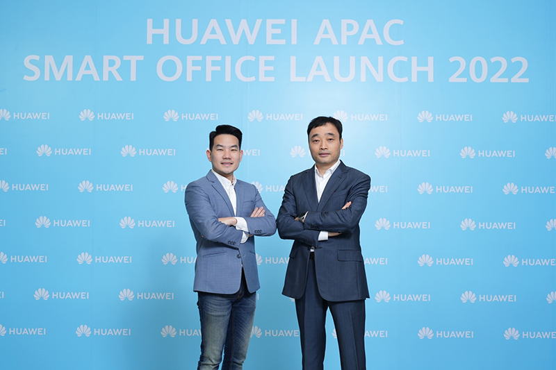 นายเกวิน เฉิง ผู้อำนวยการ ร่วมด้วย (ซ้าย) นายสหศักดิ์ เตชะธรรมจิต ผู้ช่วยผู้อำนวยการประจำประเทศไทย บริษัท หัวเว่ย คอนซูมเมอร์ บิสสิเนส กรุ๊ป (ประเทศไทย) นำทีม เปิดตัวคอนเซ็ปต์ HUAWEI Smart Office อย่างเป็นทางการทั้งในระดับประเทศและภูมิภาค ในงาน HUAWEI APAC Smart Office Launch 2022