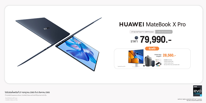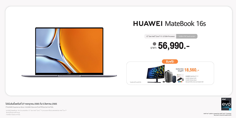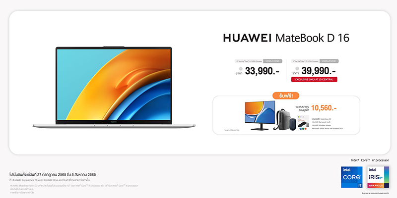 โดย HUAWEI MateBook D 16 รุ่น 12th Gen Intel® Core i5 ราคา 33,990 บาท และรุ่น i7 ราคา 39,990 บาท พิเศษโปรโมชันพรีออเดอร์ระหว่างวันที่ 27 กรกฎาคม 2565 ถึง 5 สิงหาคม 2565 รับฟรี! ของสมนาคุณมูลค่ารวม 10,560 บาท HUAWEI MateView SE มูลค่า 4,990 บาท Microsoft Office Home & Student 2021 (เวอร์ชันใช้งานตลอดชีพ) มูลค่า 3,390 บาท HUAWEI Wireless Mouse สีน้ำเงิน มูลค่า 1,090 บาท และ HUAWEI Backpack Swift มูลค่า 1,090 บาท โดยสามารถสั่งจอง HUAWEI MateBook D 16 รุ่น 12th Gen Intel® Core™ i5 ได้ที่หน้าร้าน HUAWEI Experience Store และร้านค้าที่ร่วมรายการ รวมถึงช่องทางออนไลน์ HUAWEI Store และร้านค้าอย่างเป็นทางการของหัวเว่ยบน JD Central, Shopee, Lazada และ Thisshop และสั่งจองรุ่น HUAWEI MateBook D 16 รุ่น 12th Gen Intel® Core™ i7 ได้เฉพาะบนร้านค้าอย่างเป็นทางการของหัวเว่ยบน JD Central เท่านั้น